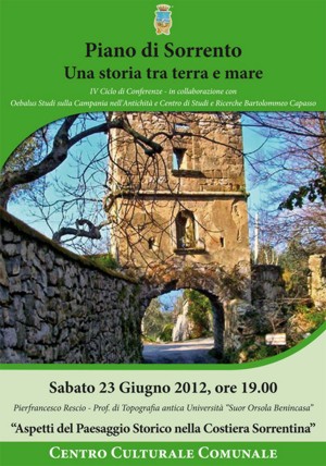 Sabato 23 giugno alle ore 19 presso il centro culturale comunale si terrà la conferenza “Una storia tra terra e mare”. L’evento fa parte del IV Ciclo di Conferenza organizzato dal Comune di Piano di Sorrento in collaborazione con “Oebalus Studi sulla Campania e nell’Antichità” e il “Centro di Studi e Ricerche Bartolomeo Papasso”. Il professore di Topografia antica dell’Università “Suor Orsola Benincasa” Pierfrancesco Rescio relazionerà sugli “Aspetti del Paesaggio Storico nella Costiera Sorrentina”.