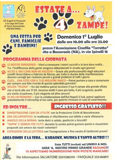 In programma per domenica 1 luglio la manifestazione “Estate a 4 Zampe”. L’iniziativa, curata e organizzata dalle associazioni non lucrative “Gli Angeli di Pasquale” e “La Lega del Cane” sezione di Torre Annunziata è alla sua prima edizione. Il programma della giornata soddisferà le esigenze di grandi, piccini e soprattutto degli ospiti quadrupedi. L’appuntamento è alle ore 10 presso la sede dell’associazione “La Torretta” di Boscoreale in via Spinelli: ci sarà la dimostrazione dei cani da utilità conla Protezione Civilementre l’educatore Fabrizio de Rienzo dispenserà consigli per l’intera durata della manifestazione. L’Asl “microchipperà” gratuitamente i cani sprovvisti di chip e sarà offerto un aperitivo ai partecipanti. Si potrà, nel corso della giornata, conoscere i cuccioli delle associazioni, scattare una foto ricordo oppure tentare la fortuna ad una pesca di beneficenza. Ma non finisce qui: nel pomeriggio ci sarà la sfilata dei cagnolini e la giuria decreterà cinque vincitori. I bambini potranno divertirsi con l’animazione, potranno truccarsi da animaletto o giocare sui gonfiabili. Ci sarà poi l’estrazione della lotteria con moltissimi premi, offerti da numerosi sponsor, e la serata karaoke. “Estate a 4 zampe” è una manifestazione-raduno ideata per sensibilizzare l’opinione pubblica in materia di randagismo e sponsorizzare le adozioni di meticci, che spesso sono abbandonati nei canili e sono considerati, erroneamente, cani di “second’ordine”. Potranno partecipare tutti: i cani, i padroni, le famiglie, ma anche i curiosi e gli appassionati, tutti potranno rilassarsi immersi nel verde gustando un panino ed una bibita e potranno trascorrere una giornata in allegria. Per ulteriori informazioni potete contattare i numeri 3299280319 e 3334168171 o visitare il sito www.gliangelidipasquale.com.