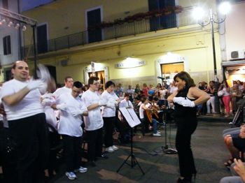 Il concerto finale del progetto “Orchestra Giovanile Michele Novaro e coro Manos Blancas”, promosso dalla prof.ssa Maria Teresa Visone e dalla d.ssa Eufrasia Calvanese, presidenti rispettivamente dell’Associazione “Michele Novaro” di Acerra e “Pandha” di Sant’Anastasia, inserito a sua volta nella manifestazione “Musicalmente insieme” ideata dalla dott.ssa Cettina Giliberti, ha trasformato via Roma in una piazza d’arte e d’estate “solare”. La felicità dei diversamente abili e delle loro famiglie, che hanno preparato un tavolo di dolci prodotti per l’occasione, è stata palpabile e condivisa dagli artisti e da tutti i presenti, esercenti compresi.