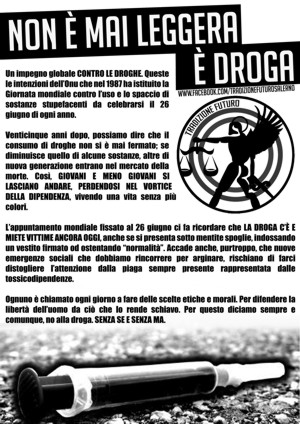 Parte da Tradizione Futuro Salerno una campagna di sensibilizzazione rivolta ai giovani e meno giovani ed incentrata sui danni che provoca la droga.“Non è mai leggera,è Droga”- recitano i migliaia di volantini distribuiti e gli striscioni esposti in occasione della giornata mondiale contro l’uso e lo spaccio di sostanze stupefacenti che si celebrerà martedi 26 giugno 2012.