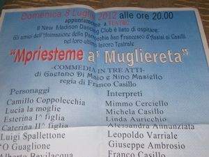 Sulla scia del successo precedente , “Gli Amici del Gruppo dell’Animazione della Parrocchia di San Francesco d’Assisi ai Casilli, ripropongono domenica 8 Luglio 2012 alle ore 20,00, presso il New Madison in Via FFSS Ottaviano, la Commedia in tre atti” Mpriesteme a’ Mugliereta”. Gli autori di questo lavoro teatrale sono Gaetano di Maio e Nino Masiello, con la regia di Franco Casillo. Personaggi ed interpreti: Camillo Coppolecchia- Mimmo Cerciello- Lucia la moglie-Michela Casillo- Esterina I’ Figlia-Linda Auricchio- Caterina II’Figlia- Alessandra Annunziata-Luigi Spallettone-Leopoldo Varriale,- 0’Guaglione-Giuseppe Ambrosio- Alberto Bevilacqua Franco Casillo- Ida la moglie, Rosetta Annunziata-Zio Alfredo Bevilacqua Antonio Cepparulo- Pat bodyguard ,Raffaele Del Giudice-Jak bodyguard Giuseppe Perrino-, Vittorio Caprese, Giovanni D’Angelo,- Amalia la sarta, Maria Felicia Carillo-Anna De Vivo, I’ Suggeritrice, Anna De Vivo, II’ Suggeritrice Maria felicia Carillo.