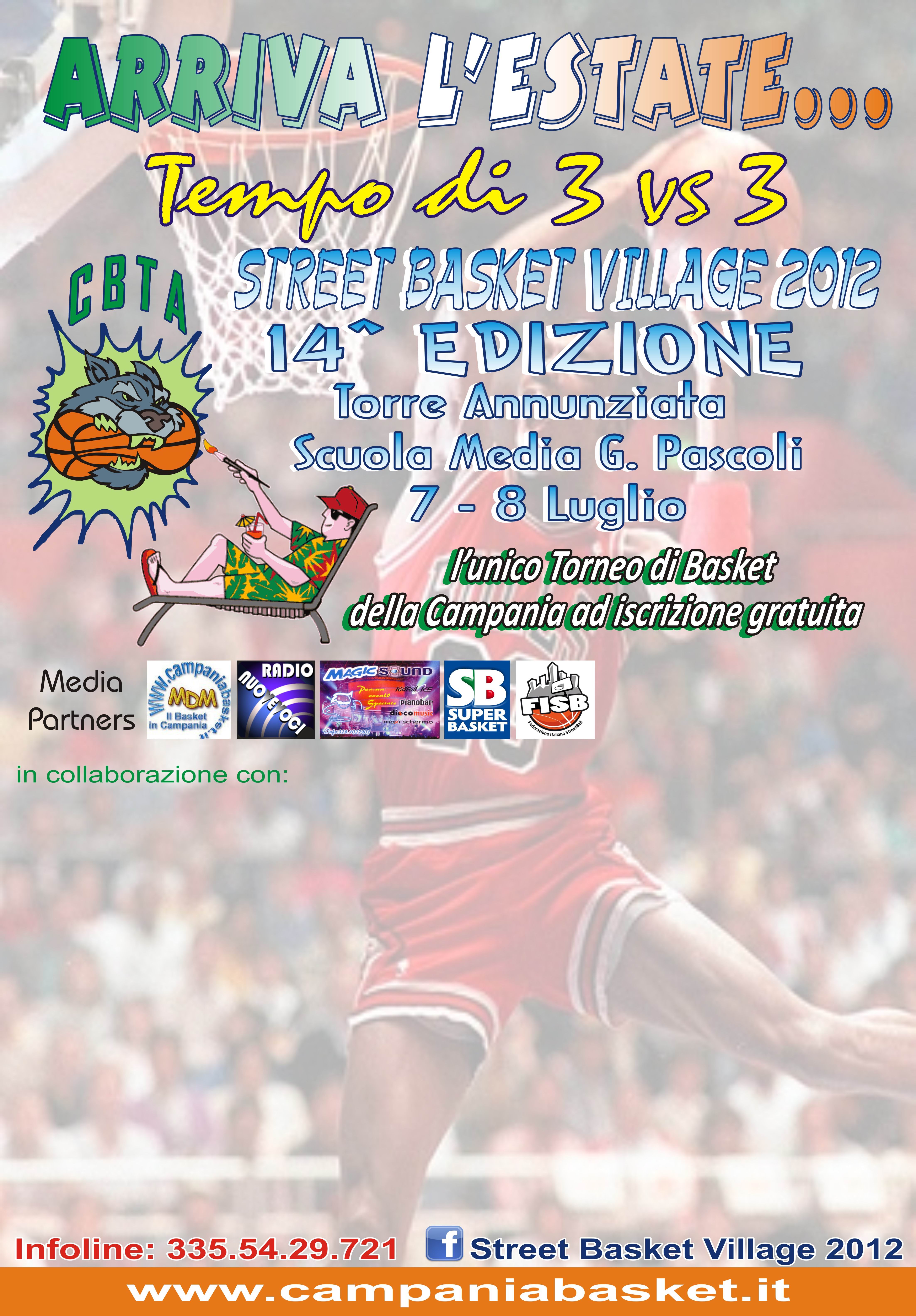 Nonostante il caldo torrido, le attività cestistiche a Torre Annunziata non si sono fermate. Lo Street Basket Village 2012 è andato in scena il 7 e 8 luglio scorsi sul campo retrostante la Scuola Media G. Pascoli per la sua quattordicesima edizione, superando ancra una volta il record di iscritti, raggiungendo quest’anno quota trecento. I giocatori e le giocatrici provenienti da tutta la Campania sono arrivati a Torre Annunziata con grande voglia e dedizione per questo sport, a dimostrazione che il basket nella cittadina oplontina è vivo più che mai ed è occasione di aggregazione per giovani provenienti da città del comprensorio spesso carenti di iniziative del genere. Con grande passione, ma anche con lavoro e sudore, Luca Michel La Rocca ed i suoi collaboratori del Centro Basket Torre Annunziata hanno reso possibile la realizzazione di questa kermesse. Il torneo, che prevedeva incontri tre contro tre e svoltosi, come di consueto, nelle due giornate di sabato e domenica, è stato spettacolare e di grande livello agonistico. Gli sfidanti e le sfidanti delle numerosissime squadre si sono battuti fino all’ultimo canestro per conquistare la vittoria, dimostrando tutti, anche nella sconfitta, grande sportività e rispetto reciproco. Ma ad aggiudicarsi il trofeo, si sa, alla fine è sempre un solo vincitore. Le categorie in gioco quest’anno sono state quattro, invece delle tre previste nelle precedenti rassegne, in virtù dell’aggiunta del minibasket alle categorie senior, junior e femminile. Secondo l’antica regola di galanteria del “prima le donne”, la finale femminile è stata la prima ad essere disputata, vedendo trionfare la squadra “Stobenesessanta” composta da quattro ragazze provenienti rispettivamente da Gragnano, Scafati, Napoli e San Giorgio a Cremano, capitanate da Fabiana Fedeli di San Giorgio, che si è aggiudicata anche la gara del tiro da tre punti e il premio di miglior giocatrice.