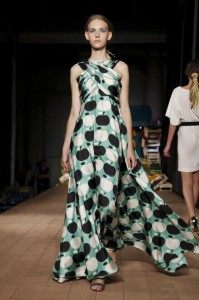 viene ripetuta serigraficamente per tutto l’abito – la mela sul long dress incrociato sul davanti – ;