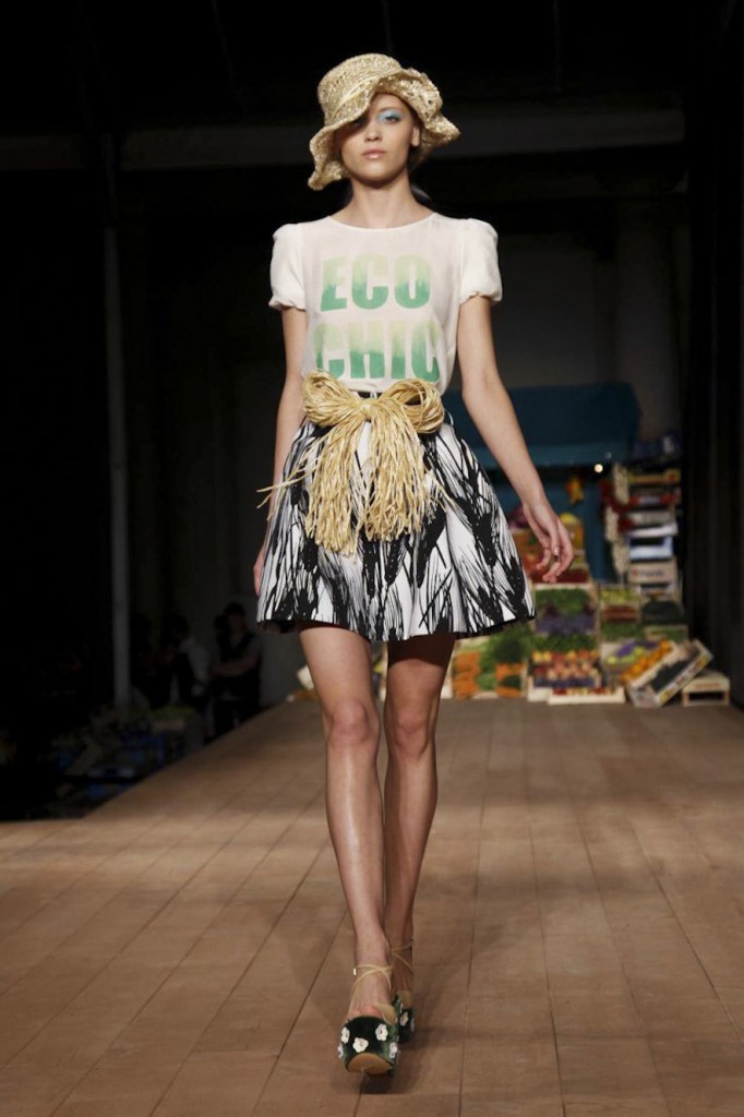 – multicolor quando si stagliano sulle t-shirt in cotone adornate da maxi fiocchi in rafia portate con gonne a ruota dal print b/w – padroneggia la scritta Eco-Chic che rimarca il tema e l’intento