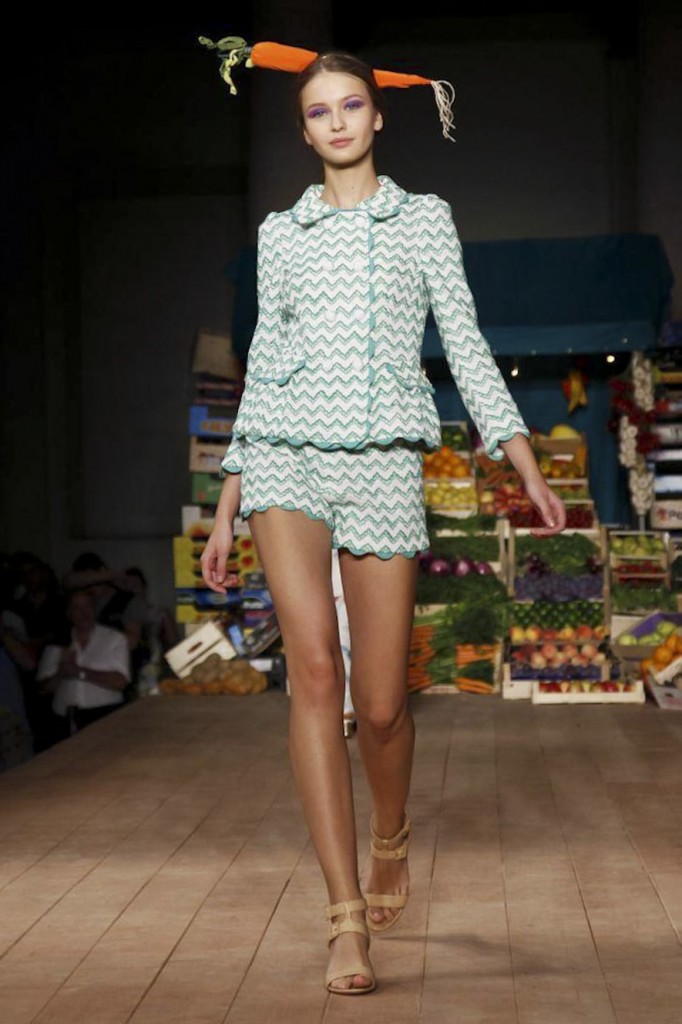 Banconi di frutta e verdura, tendoni colorati e cartelli con su scritto i prezzi delle primizie . Un mercato ortofrutticolo diventa l’insolita location per un’altrettanto insolita collezione che vede tra i banconi traboccanti di fiori , frutta e verdura sfilare le proprie creazioni che rimandano , appunto , al Beauty Food .
