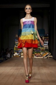 dissacrante , gioioso , divertente e leggero di Moschino Cheap and Chic da vita a creazioni frizzanti pronte a giocare con le stampe :