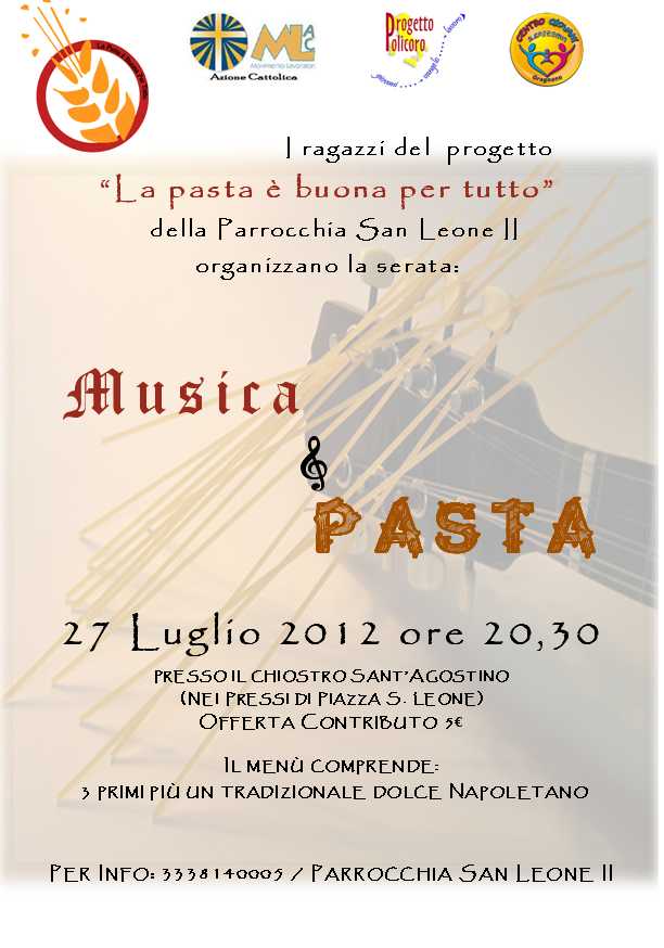 La musica napoletana tradizionale e le poesie sulla pasta ed il vino troveranno nella I° edizione “Musica e Pasta” un perfetto abbinamento con i diversi piatti tipici gragnanesi che potrete degustare assieme al nostro inimitabile vino.