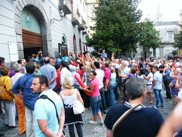 Il sindaco, Carmine Esposito, è chiaramente amareggiato per quanto accaduto ieri sera a Palazzo Siano: in sala consiliare é in corso il preannunciato incontro sul percorso finora fatto verso il nuovo PUC. Fuori dal palazzo e in piazza le Forze di Polizia. Suoni di fischietti annunciano l’arrivo del corteo programmato dal comitato di via Romani per protestare e, come riportato in un loro volantino, presidiare il Comune per “far sentire la propria voce” contro la realizzazione dell’isola ecologica nell’area approvata dal Consiglio Comunale. Ragazzini, ragazzine e adulti, tra cui il consigliere di opposizione (PD) Franco Casagrande con lo striscione “Si all’isola ecologica, ma lontano da case e scuola“ sono in testa al corteo di circa 70 persone. Il loro tentativo di entrare in sala consiliare viene fermato dalla PS. che dialoga con alcuni di loro, poi pressata dalla folla, è costretta a schierarsi e ad impedire ingressi al Comune. Il sindaco esce, ascolta alcuni di loro, tra slogan e fischietti, rientra. Seguono epiteti contro di lui, momenti di tensione, la PS indossa i caschi. E ascoltiamo un consigliere di opposizione dire:”Signora non allontanatevi, dobbiamo stare qui, così non si fa il convegno”. In sala consiliare, invece, il convegno continua.