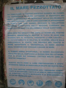 Il manifesto. Il risveglio dal letargo dell’opposizione porticese è avvenuto mediante l’affissione di un manifesto nel quale è stato trattato, ancora una volta, l’argomento balneabilità. “La coalizione di centrosinistra – si legge nel manifesto firmato da sei partiti di centrodestra, dal titolo ‹‹il mare pezzottato›› – guidata da Cuomo, ha tappezzato le mura cittadine di manifesti nei quali si inneggiava al miracolo della balneabilità del nostro mare. Come è loro costume si appropriano di meriti che non hanno, essendo il collettore un’opera effettuata dalla Regione Campania. Cosa ben più grave – continua la locandina – è che dopo lo scoop del nostro sindaco e l’avvistamento di delfini, si scopre, grazie alla capitaneria di porto, che proprio nel tratto di mare antistante il Granatello, ci sono ancora degli scarichi che versano liquami in mare. Il dubbio sorge spontaneo: ci hanno raccontato un’altra balla? Questa volta però il loro protagonismo è stato eccessivo perché si gioca sulla salute dei nostri figli”.