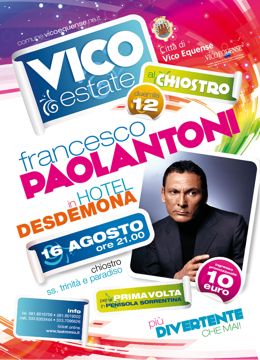 Una kermesse lunga tutto il mese di agosto quella che caratterizzerà questa seconda parte dell’estate 2012 a Vico Equense. Artisti di primissimo calibro, come Rosalia Porcaro, Biagio Izzo, Monica Sarnelli, Peppe Servillo e Solis String Quartet, calcheranno il palcoscenico allestito nel Chiostro della Santissima Trinità e Paradiso. Da segnalare in cartellone il ritorno a teatro nel triplice ruolo di autore, regista e interprete protagonista di Francesco Paolantoni, con la commedia “Hotel Desdemona”, in scena per la prima volta a Vico Equense e in Penisola Sorrentina, giovedì 16 agosto 2012 ore 21.00. Con questa opera teatrale, il comico partenopeo decide di allontanarsi dal solito repertorio, De Filippo, Scarpetta ecc… per mettere in scena l’autore classico per eccellenza: Shakespeare. E, più precisamente, “Otello”. Sceglie quest’opera perché vuole comunicare il suo pensiero sulla gelosia, sentimento che, secondo lui è la rovina di tutti i rapporti. Inoltre, sostiene che con questo degrado politico e culturale, con i tagli allo spettacolo, solo le compagnie filodrammatiche, che hanno poche spese e molti sponsor, hanno la possibilità di permettersi questi allestimenti, ma, a rovinare la messa in scena, ci penseranno gli attori stessi (tutti rigorosamente sempre in scena). Il pubblico assisterà, nel corso del racconto, alle complicate e divertentissime prove dello spettacolo, alle deliranti ed esilaranti discussioni interpersonali tra gli attori, ad amori che nascono, ad amori che muoiono, fino alla messa in scena dello spettacolo, dove il teatro nel teatro la farà da padrone, ma in un modo inconsueto: si assisterà contemporaneamente e simultaneamente sia alla impietosa e dissacrante, messa in scena di “Otello” (Francesco sarà addirittura costretto a cambiare il finale) sia agli strambi eventi che gli attori stessi dovranno affrontare nei camerini, per arrivare poi all’happy end finale. Ma lo spettacolo continuerà oltre la fine, il pubblico sarà coinvolto in una novità assoluta per il teatro: ci sarà, come solitamente accade con i dvd, la possibilità di vedere le scene tagliate e gli inserti speciali. Coinvolgimento totale con il pubblico, sia dal punto di vista dialettico che fisico.