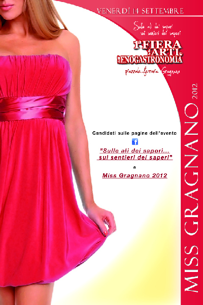 Sono arrivati già i primi moduli di iscrizione per partecipare alle selezioni del I concorso “Miss Gragnano 2012”! Il concorso di bellezza, che si terrà durante la fiera “Sulle ali dei sapori … sui sentieri dei saperi” – 1a Fiera delle arti e dell’enogastronomia nei giorni 12-13-14 settembre, eleggerà la ragazza più bella della città di Gragnano.