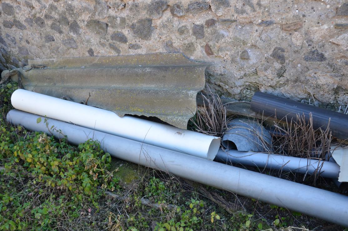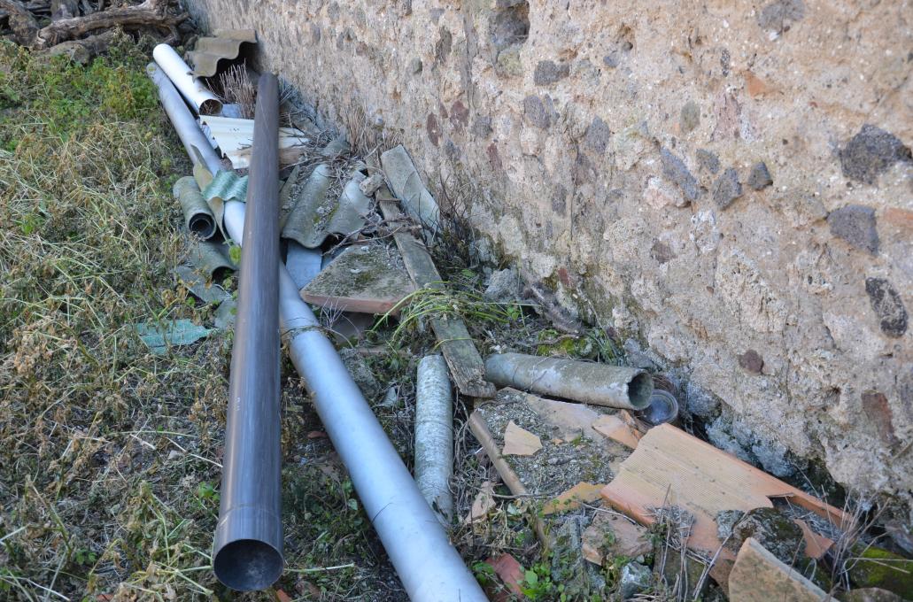 Tratti di tubazioni con relativi frammenti in cemento amianto accantonati c/o il muro perimetrale interno della Casa N. 14 – peso presunto 50kg