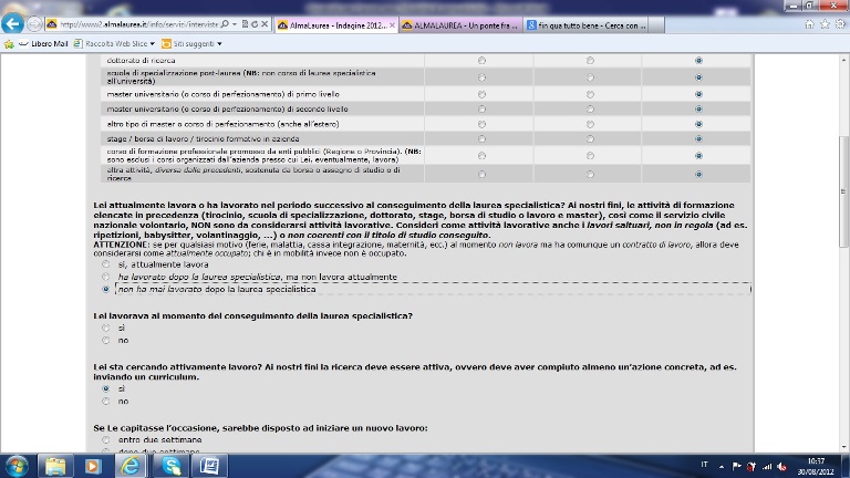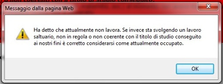 E se tra i laureati ci fosse qualcuno con difficoltà a comprendere il senso della richiesta, al momento della risposta compare un vistoso avviso che ricorda e sottolinea che: anche se si svolge “un lavoro non in regola è corretto considerarsi come attualmente occupato”. Incredibile, ma vero.
