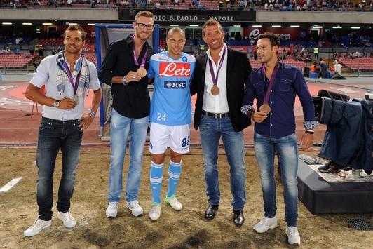 Sono quattro i tifosi speciali ospiti del Napoli. Prima del match con la Fiorentina Diego Occhiuzzi, Luigi Tarantino vesuviano DOC di Ottaviano, stesso paese nativo di Giuseppe Sannino ora tecnico del Palermo. Vincenzo Mangiacapre e Mauro Sarmiento hanno ricevuto l’applauso del San Paolo. I quattro atleti campani sono stati protagonisti a Londra 2012 vincendo le medaglie olimpiche. Occhiuzzi argento e bronzo nella sciabola individuale e a squadre, Tarantino bronzo nella sciavola a squadre, orgoglio della cittadina ridente alle falde del vesuvio e grande tifoso del Napoli che alla prima al San Paolo realizza un sogno, quello di calcare il terreno che è stato la storia del calcio. Inoltre oltre a Tarantino sono stati omaggiati,Mangiacapre bronzo nel pugilato e Sarmiento bronzo nel Taekwondo hanno ricevuto in dono dalla Società azzurra la maglia ufficiale personalizzata col proprio nome. Ad accompagnare gli olimpionici azzurri Gokhan Inler, che ha fatto gli “onori di casa”.