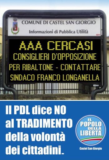 Con un blitz antidemocratico, Franco Longanella ha deciso inopinatamente di revocare i due Assessori del PDL, vale a dire il vicesindaco Soglia Nobile (primo eletto alle ultime elezioni amministrative e consigliere più votato di sempre dall’introduzione della preferenza unica) e Massimo Barba, perché espressione e riferimento del Popolo della Libertà. La loro colpa? Avere sempre e comunque messo davanti ad ogni cosa l’interesse di Castel San Giorgio e di avere preteso che si rispettasse il patto fiduciario (sacro) con gli elettori.