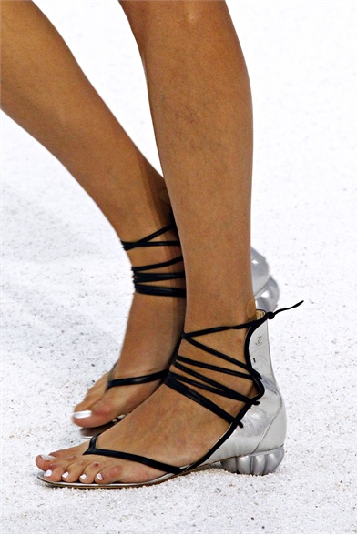 giacche ben destrutturate. Ai piedi sandali piatti in argento..Calzari divini dal tacco –basso- a forma di conchiglia.