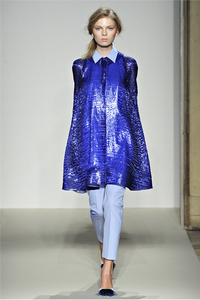Ancora tramonto, ancora il mare, le sue acque e i suoi colori. Le immagini notturne di Gerhard Richter diventano materia di ricerca cromatica e materica per Gabriele Colangelo. Tele come abiti che si aprono a trapezio su pantaloni a sigaretta dipingendosi di un bluette profondo che nasconde ora tra le fitte pieghe- stirate-, ora tra i drappeggi asimmetrici , la scia del sole “bruciato” che tramontando, si spegne nell’acqua. Una dimensione da sogno che permette alla mente di scorrere proprio tra quelle acque. Una dimensione vasta, infinita..proprio come il mare.