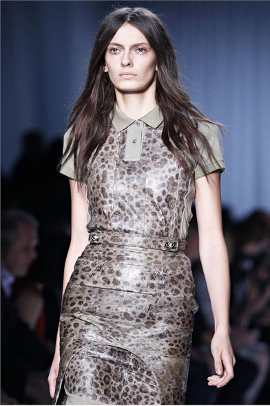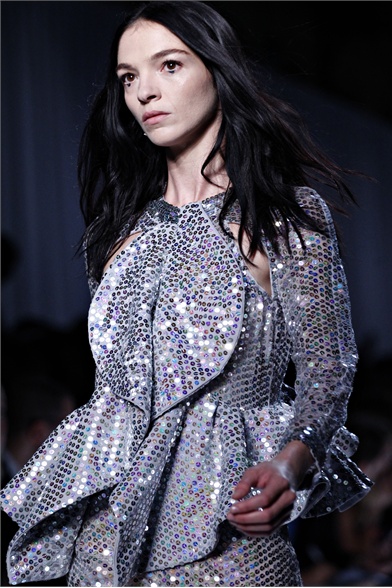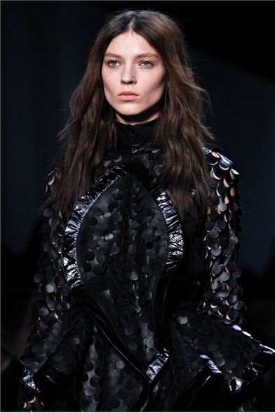 rigidi. E lo sguardo si posa, incuriosito, rapito, sulle applicazioni di paillettes multicolor, sulle bordature di pelle di pesce – anguilla, razza, serpente d’acqua- ..Pura sperimentazione,originale innovazione condita da una buona dose di coraggio quella intrapresa da Riccardo Tisci. Ogni collezione porta la firma di un nuovo, incredibile linguaggio.