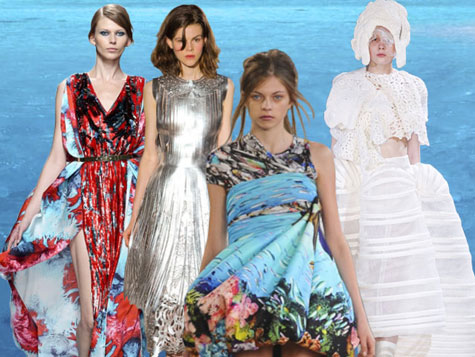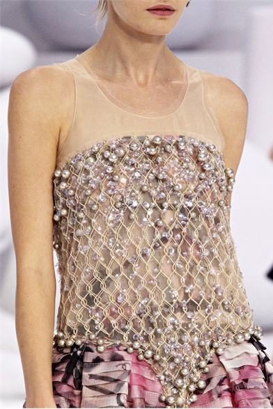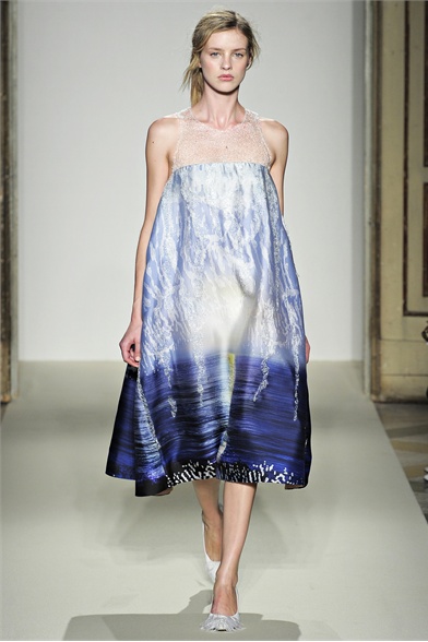 Il mare e i suoi fondali sono stati fonte d’ispirazione per molte designer, diventando, così, una delle tematiche principali delle collezioni estive 2012. Addirittura, c’è chi, come Chanel ha pensato di ricreare le fattezze di un acquario per far si che le proprie ninfe leggiadre potessero avere l’habitat adatto. Ed ecco abbaglianti figure di cavallucci marini, pesci, ostriche, rocce irradiare lo spazio di una liquida opalescenza, sommessa e sommersa..Le figlie di Poseidone sfilano con abiti chiari, lucenti grazie alla perlescenza dei tessuti. Iridescenze come conchiglie, nacré come scaglie di creature marine, con arruffature vaporose simili ad alghe appoggiate sia sulle spalle o agglomerate per formare una gonna. Abiti-tubino si fermano sotto il ginocchio dando vita a forme sottili che modellano la silhouette. Maxi perle prendono il posto dei bottoni ed ecco adornare tasche applicate, polsi per poi risalire e intrappolarsi qua e là