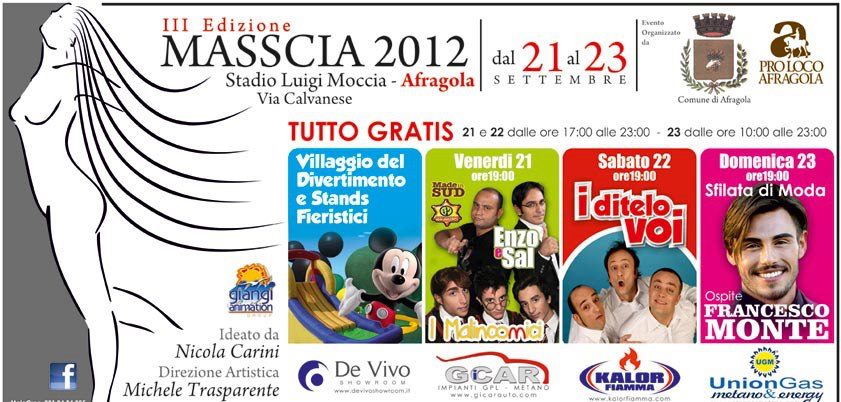 In MASSCIA 2012 ogni settore coinvolto, vanta una figura professionale che in qualche modo rende lustro alla città di Afragola. La moda, è affidata al creativo event planner Michele Trasparente, l’arte alle mani esperte dello scultore Domenico Sepe, che si occupa anche di cultura, lo sport a Bruno Rigione, lo spettacolo a Giulio Carfora, l’imprenditoria al noto Nicola Carini.