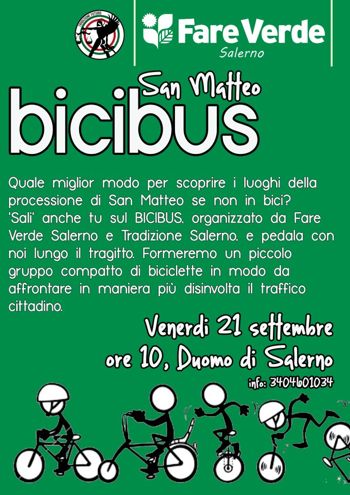 “Fare Verde Salerno” e “Tradizione Futuro Salerno” in occasione di San Matteo organizzano una biciclettata mattutina alla scoperta della mobilità sostenibile. La partenza è prevista per le 10 di mattina del 21 settembre davanti al Duomo di Salerno e procederà per lo stesso percorso che poche ore dopo verrà attraversato dalla processione in onore del Santo Patrono. «La manifestazione cade in occasione della “Settimana europea della mobilità sostenibile” –commenta Francesco Bove, responsabile cittadino di Fare Verde- a Salerno, complice il caro benzina e la crisi del trasporto pubblico, in molti stanno riscoprendo l’uso delle biciclette, mezzo di trasporto salutare e completamente eco-compatibile. Purtroppo siamo agli ultimi posti in Italia per lunghezza delle piste ciclabili ed auspichiamo una svolta in tal senso da parte degli enti preposti». A commentare l’iniziativa anche il presidente di Tradizione Futuro Giovanni Cirillo: «Dobbiamo riscoprire queste forme di mobilità alternativa, in tal modo si possono vivere meglio le città ed i centri storici scoprendone appieno le bellezze e le tradizioni. Chiediamo, per questo, lo sviluppo della città in tal senso, prevedendo lungo le principali arterie stradali, piste ciclabili ed aree attrezzate».