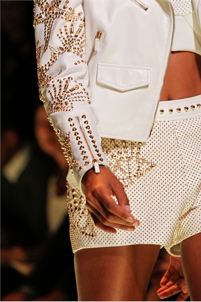 Cavalcando l’onda –è proprio il caso di dirlo- dei trend sicuramente sarebbe affascinata dalla pelle e ai suoi rimandi rock..Dunque, via squame – e paillettes – , solo borchie. Pronte a creare vortici di stelle marine, quasi fossero ricami décor.