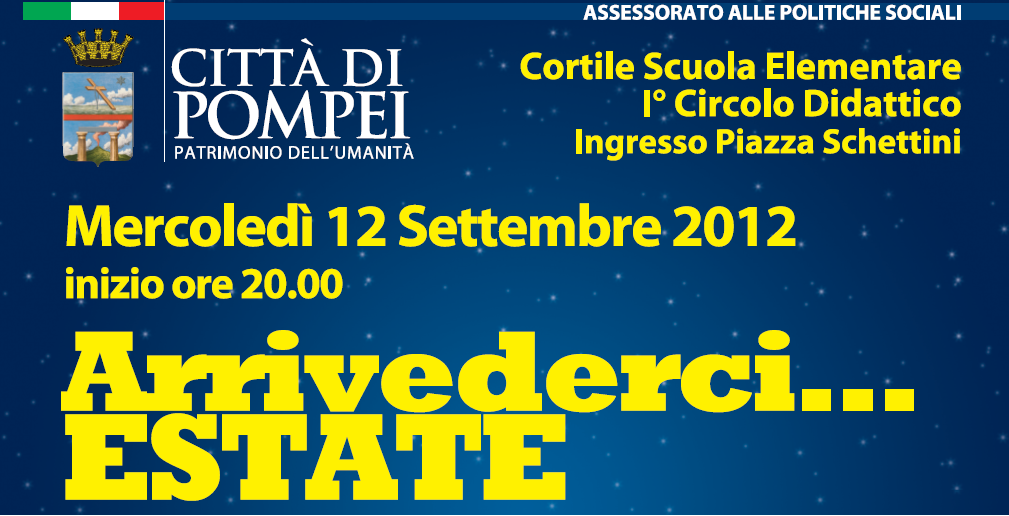 La ricca agenda di appuntamenti ha visto nella giornata di mercoledì 12 settembre 2012 la serata conclusiva. La manifestazione finale dal titolo “Arrivederci…estate” ha avuto luogo nel cortile della scuola elementare “Luigi Leone” sita alla piazza Schettini. Nel corso della serata sono state offerte numerose degustazioni di prodotti tipici locali gentilmente messi a disposizione da imprenditori pompeiani.