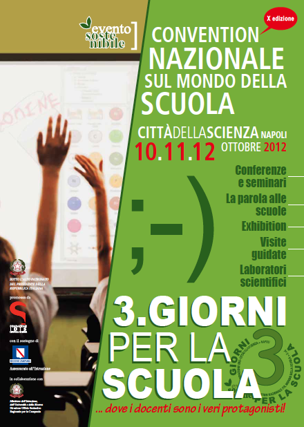 Tre giorni per la Scuola rientra nelle attività di sostegno alla diffusione del sapere scientifico, definite dal Protocollo d’Intesa sottoscritto il 26 marzo 2012 dalla Fondazione Idis-Città della Scienza e dal Ministero dell’Istruzione, dell’Università e della Ricerca.Un momento di aggiornamento, di scambio tra docenti e dirigenti scolastici provenienti dalle diverse regioni italiane e un’occasione per visitare Città della Scienza con il suo Science Centre, Futuro Remoto e conoscere tutte le novità in programmazione riservate alle scuole.