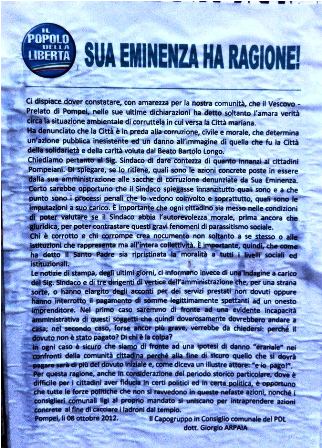 Da qualche giorno nelle strade di Pompei campeggia il manifesto realizzato dal consigliere comunale Giorgio Arpaia, PdL, sulla “questione morale” nostrana. Più che un j’accuse si tratta di una richiesta di spiegazioni che dal Palazzo, come si sa, tardano a venire. Lo spunto del documento firmato dal capogruppo del PdL, è l’omelia di Monsignor Carlo Liberati che ha denunciato la corruttela dilagante. Quella del delegato pontificio, secondo Arpaia, è “l’amara verità”: “la città è preda di una corruzione, civile e morale, che determina un’azione pubblica inesistente e un danno all’immagine di quella che fu la città della solidarietà e della carità voluta da Bartolo Longo”. Due i chiarimenti reclamati da Arpaia. Innanzitutto, sulle azioni, intraprese dall’amministrazione, per contrastare i fenomeni di criminalità diffusa denunciati dal Prelato. In secondo luogo, il sindaco dovrebbe dare conto ai cittadini di “quali sono e a che punto sono i processi penali che lo vedono coinvolto, e quali sono le imputazioni a suo carico”. Il riferimento è alle indagini in corso su presunte somme dovute e non pagate dal comune alla ditta Russo, incaricata della rimozione forzata delle auto. Una cifra che ammonterebbe, secondo alcune indiscrezioni, a più di un milione di euro. Infatti, sostiene Arpaia, quelli che secondo la stampa sono indagati, cioè il sindaco e tre dirigenti dell’amministrazione, “o hanno elargito acconti per servizi non prestati, o hanno interrotto il pagamento di somme legittimamente spettanti”. Ovvero, se le competenze non erano dovute, non erano dovute le anticipazioni. Se invece le somme erano dovute, non si comprende come mai i pagamenti siano stati interrotti. In ogni caso, per il consigliere, “siamo di fronte a un “danno erariale” nei confronti della comunità cittadina, perché alla fine quello che si dovrà pagare sarà più del dovuto iniziale”. Quindi sarebbero necessarie, almeno, delle spiegazioni, affinchè “ogni cittadino sia messo nelle condizioni di poter valutare se il sindaco abbia l’autorevolezza morale, prima ancora che giuridica, per poter contrastare questi gravi fenomeni di parassitismo sociale”. Dare conto ai cittadini, del resto, è la caratteristica imprescindibile della democrazia. Ci auguriamo, pertanto, che questa volta, su questioni di un tale rilievo, il sindaco senta il dovere di rispondere, dimostrando di condividere lo spirito democratico. Altrimenti i cittadini continueranno a pensare che l’unica risposta sia l’antipolitica. E una chiusura verso la società civile dimostrerebbe che, in fondo, hanno ragione.