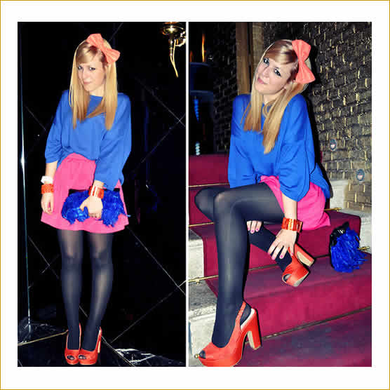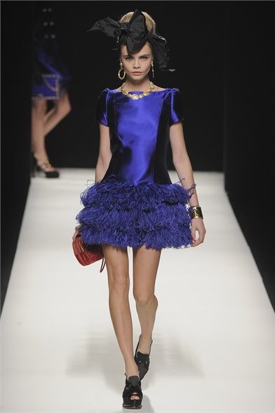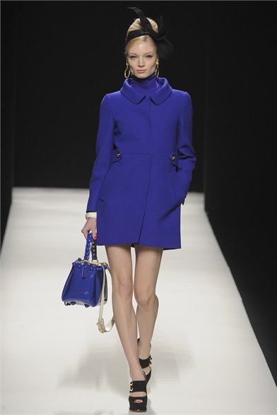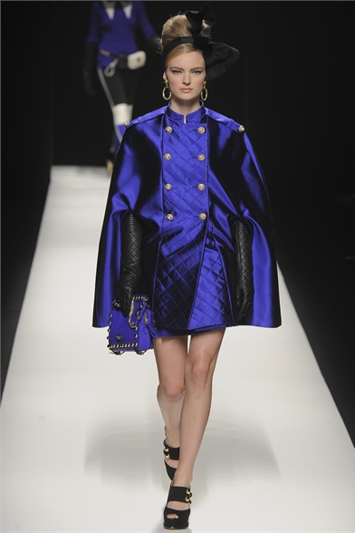 Sgargianti e cangianti come nella collezione MOschino A/I 2012-13 : un tripudio di elegante femminilità mixata ad accenti biker –vedi guanti in pelle e maxi occhiali-. Riot girl scegliendo però tubini e pencil skirt, cappotti dal taglio semplice , pulito e sfoggiando ricami décor di borchie e catene. Shocking blue mixato al cupissimo nero. Scambio di ruoli!!