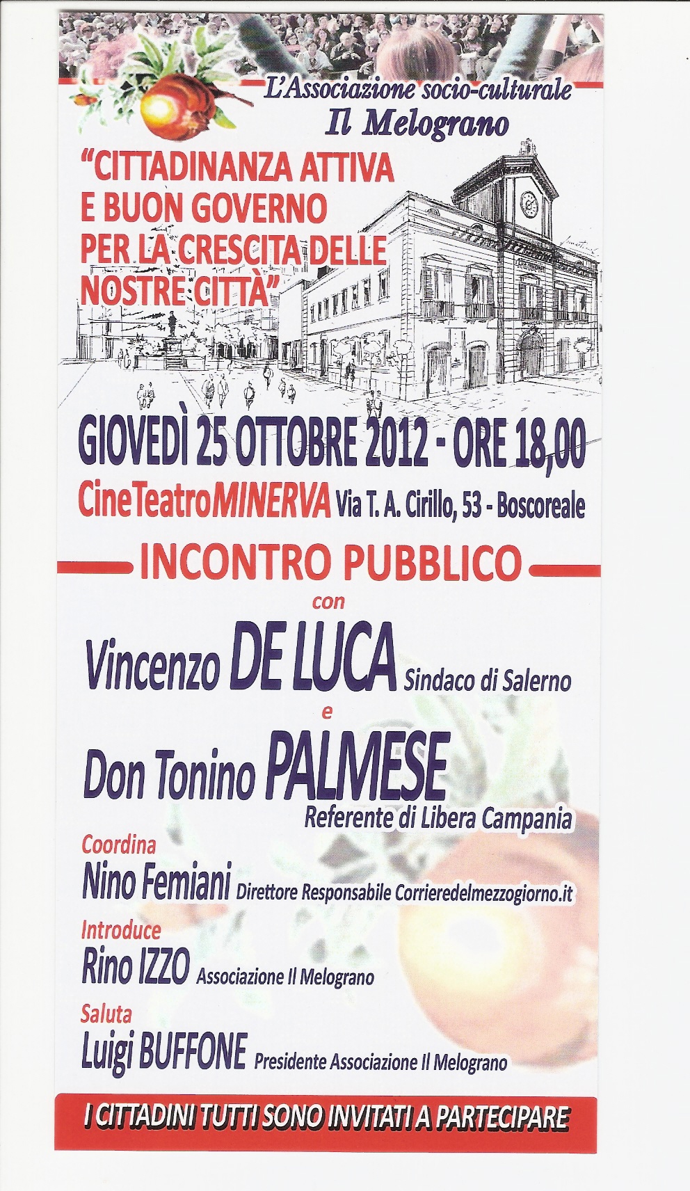 Alle ore 18 presso il Cineteatro Minerva a Boscoreale si terrà un incontro pubblico moderato da Nino Femiani, Direttore Responsabile del Corriere del Mezzogiorno e da Vincenzo de Luca, sindaco di Salerno. Inoltre prenderà parola Don Tonino Palmese, referente di Libera in Campania, l’associazione nata nel 1995 con l’intento di sollecitare i cittadini a lottare contro le mafie e promuovere la legalità e la giustizia.