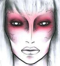 Creatura infernale? Lentine bianche, cerone bianco steso anche sulla labbra, contorni del viso enfatizzati da un ombretto grigio, insistendo soprattutto ai lati del naso come fosse un counturing. Pigmento rosso sfumato tutto attorno gli occhi tirato, poi, sulle guancie.