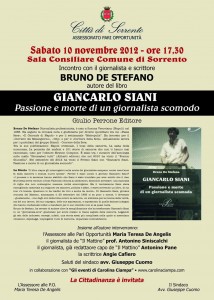 E’ previsto per Sabato 10 Novembre, alle ore 17.30, presso la sala Consiliare del Comune di Sorrento, l’incontro con il giornalista e scrittore Bruno De Stefano autore del libro “Giancarlo Siani passione e morte di un giornalista scomodo” di Giulio Perrone Editore.