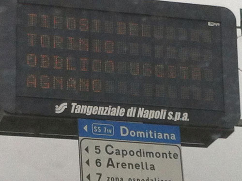 “Nonostante i padaggi più alti d’ Europa che i napoletani pagano per circolare sulla tangenziale – dichiano il commissario regionale dei Verdi Ecologisti Francesco Emilio Borrelli ed il capogruppo al comune di Napoli del Sole che Ride carmine Attanasio – diretta dall’ ex ministro e deputato democristiano, berlusconiano e mastelliano Paolo Cirino Pomicino il personale addetto non è neanche in grado di scrivere sui tabelloni segnaletici delle indicazioni in italiano corrente. Infatti stamane lungo tutto il percorso della tangenziale sono apparsi dei cartelloni con su scritto: “tifosi del Torinio obblico uscita agnano” ( testuale ). Chiunque li ha letti è rimasto sbigottito”. “Purtroppo – continuano Borrelli e Attanasio – non è la prima volta che la tangenziale mette in evidenza messaggi sbagliati o scritti da persone che non hanno una conoscenza stentata della lingua italiana esponendo la nostra città ai soliti sberleffi para leghisti e razzisti. Pomicino e la tangenziale dovrebbero chiedere scusa per i soldi che sottraggono ai napoletani in cambio di un servizio a nostro avviso molto scadente e soprattutto in vista dell’ ennesimo scandaloso aumento di altri 5 centesimi a passaggio previsto per il 31 dicembre 2012”.