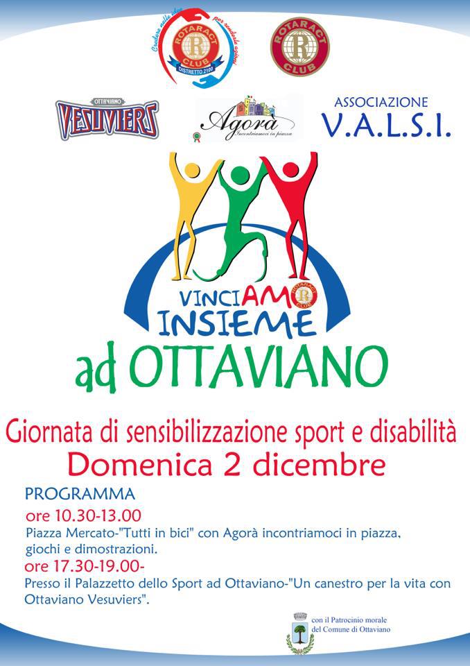 Una giornata dedicata allo sport inteso come momento di crescita , aggregazione e confronto tra normodotati e diversamente abili . La manifestazione avra’ inizio al mattino dalle ore 10.30 alle 13.00 presso Piazza Mercato in Ottaviano. La piazza sarà trasformata in un percorso programmato e chiuso al traffico. La cintura esterna adibita a pista ciclabile ci si potra’ muovere in bicicletta , pattini , carrozzelle e quant’altro mentre nella parte centrale saranno organizzati punti di gioco attrezzati per attivita’ sportive come basket, mini tennis ecc.. Sarà possibile accedere al percorso dai varchi di via Roma e Piazza Duca D’aosta.