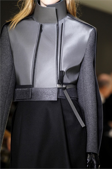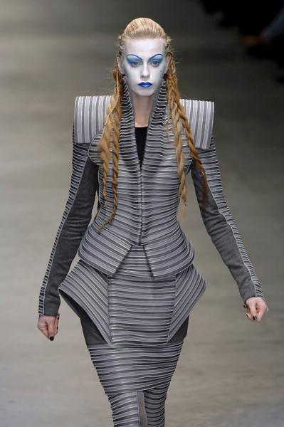 spalle esagerate e giacche tagliate a laser dalle influenze eighities. Non mancano gonne rigide ad A, pencil skirt in vernice, abiti in chiffon con bordi gommati, bluse dal taglio rigido infilate in pantaloni a vita alta arricciati in vita.Ma Cyber è anche il trucco. Il viso trasformato in una sorta di robot-face con la pelle schiarita da un gioco di creme e polveri luminescenti che danno un’aria etera. Ombretto grigio chiaro sfumato su l’intera palpebra e le labbra illuminate da un gloss multiriflettente.