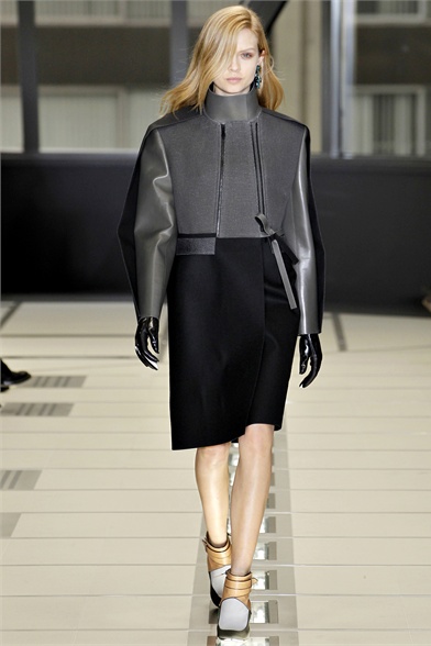 spalle esagerate e giacche tagliate a laser dalle influenze eighities. Non mancano gonne rigide ad A, pencil skirt in vernice, abiti in chiffon con bordi gommati, bluse dal taglio rigido infilate in pantaloni a vita alta arricciati in vita.