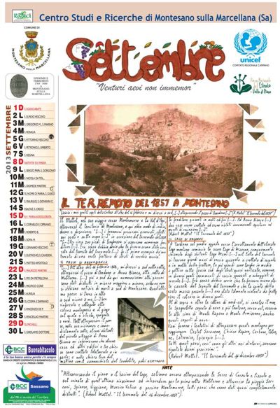 Gennaio è dedicato alla carestia del 1764, che affamò la popolazione del salernitano causando anche una epidemia e ben 332 morti a Montesano in un anno: “si mangiavano erbe selvagge condite con sale, che a volte erano velenose, e non mancarono casi di cannibalismo”. L’epidemia di Colera del 1836-37 nel Vallo di Diano è il tema affrontato nei 4 mesi successivi: si parte dal mese di Febbraio, con le prime avvisaglie dell’epidemia e le relative conseguenze in particolare nei Comuni di Atena, Padula e Monte San Giacomo, per arrivare al mese di Marzo con le “misure di prevenzione” adottate a Montesano, che però non riuscirono ad evitare il diffondersi della malattia. Come si evince dal mese di Aprile: “Nel 1837 i morti a Montesano furono 225, dei quali 18 per colera” recita il libro dei morti parrocchiali, ma nel successivo mese di Maggio apprendiamo che in realtà le vittime -secondo le comunicazioni dell’allora sindaco Giovanni Supino- furono probabilmente più di 100 nella sola Montesano, su 182 ammalati. Nel mese di Giugno si sviscera l’epidemia di vaiolo del 1839, seguita nello stesso anno da quella di tifo alla quale il Centro Studi dedica il mese di Luglio. Il tremendo terremoto del 1857, che causò più di 10mila vittime in Basilicata e Campania, ed in particolare nella Val D’Agri e nel Vallo di Diano, occupa i mesi di Agosto (con la spedizione scientifica di Robert Mallet), di Settembre (con le conseguenze a Montesano), di Ottobre (con i danni subiti dalle chiese, in particolare quella di Santa Sofia) e di Novembre (con la gratificazione ad un eroico medico di Montesano per l’assistenza prestata ai feriti rimasti imprigionati sotto le macerie degli edifici dopo la scossa). Il mese di Dicembre è dedicato al colera del 1884, con le disposizioni del sindaco e della giunta per affrontare l’epidemia. Dunque anche dietro il calendario 2013 ci sono mesi di lavoro e di ricerche operate dal Centro Studi Radici, con documenti rintracciati presso l’Archivio di Stato di Salerno, varie Biblioteche in Campania e Basilicata, l’Archivio del Comune di Montesano, l’Archivio Parrocchiale e l’opera di Robert Mallet.
