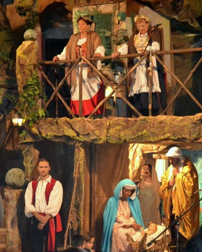 Ciò che rende sicuramente unico lo spettacolo è la struttura scenica. Essa si erge su due piani praticabili ed occupa l’intero braccio destro del transetto del Santuario delle dimensioni di 11x8x6 metri. È costruita secondo i canoni tipici del presepe fatto in casa e ne riproduce tutti gli ambienti più caratteristici (acqua, osteria, discesa, puosto del pesce, della frutta). Il pubblico è comodamente seduto tra i banchi della chiesa che può ospitare anche più di 400 spettatori nel solo spazio tra il presbiterio e il braccio sinistro del transetto.