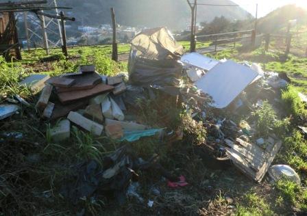 proseguendo è visibile, sulla destra (lato Nord), una proprietà delimitata da un accesso carrabile con recinzione e un vasto piazzale cementato (ad uso parcheggio) nonché una casetta con tetto a due falde e comignolo, di recente realizzazione; più avanti si giunge ad un piccolo slargo che conduce, a destra, in un’altra villa, delimitata da un muro in pietra: all’interno è visibile un nuovo volume con copertura spiovente ed assi in legno; la casa in questione si sviluppa a nord del promontorio, dove affaccia con un ampio terrazzo delimitato da balaustra a colonnine; su tale versante è visibile un muro in costruzione in sfoglie di pietra; dopo lo slargo il sentiero discende e torna ad essere sterrato; a tal punto, ci si imbatte in una serie di stalle e baracche per ricovero mucche ed in manufatti in blocchi di calcestruzzo, legno, ferro e lamiere; ai margini del tracciato sono visibili diverse discariche o depositi di materiali (ferro, lamiere, contenitori in plastica, tubi, copertoni, materiali edili, reti, bancali in legno, mobilia, parte interna di materassi, elettrodomestici, ecc.); tali materiali vengono usualmente inceneriti assieme alle erbe ed ai residui vegetali.