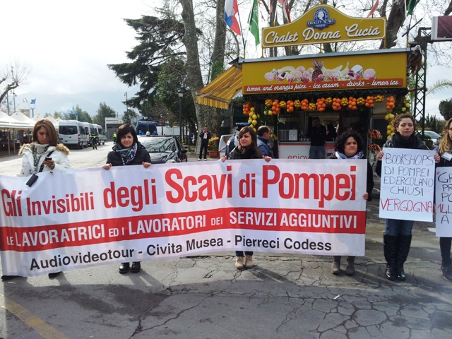Invisibili. Così si sono chiamati i lavoratori dei Bookshops degli Scavi di Pompei e Ercolano, siti dove transitano milioni di turisti e il loro lavoro è essenziale. Sono rimasti invisibili, purtroppo, anche agli occhi di ben tre ministri che hanno inaugurato i cantieri del grande progetto Pompei. A fronte dei milioni di euro sciorinati e dei concorsi di idee decantati la loro storia sembra piccola eppure emblematica, gettando un’ombra di dubbio sulla fattibilità di quei progetti faraonici. La protesta degli invisibili è andata in scena nella mattinata di mercoledì 6 febbraio nello spazio antistante l’entrata di piazza Esedra, proprio vicino a quelle bancarelle che ne sostituiscono involontariamente il lavoro. La data e il luogo non erano scelti a caso: proprio lì sarebbero entrati i ministri Ornaghi, Barca e Cancellieri insieme al commissario europeo Hahn. Le autorità sfilano ma passano oltre. Partono i fischi e i manifestanti restano lì con i loro striscioni e la loro dimostrazione pacifica. Se qualche rappresentante delle istituzioni si fosse sentito in dovere di fermarsi avrebbe potuto conoscere la loro vicenda kafkiana. Se, come ha sostenuto il ministro Barca, si apprende sperimentando avrebbero avuto qualcosa da apprendere da loro per evitare che accadesse con altri lavoratori o altri appalti. Dal 25 gennaio 2013, infatti, i bookshops di Pompei e Ercolano sono chiusi a causa di un contenzioso tra Soprintendenza e Mondadori, aggiudicataria del servizio. I dipendenti hanno ottenuto un incontro con la Soprintendente Teresa Elena Cinquantaquattro la quale avrebbe dichiarato di essere in attesa di un parere dell’Avvocatura di Stato. I sindacati hanno chiesto la cassa integrazione straordinaria su cui dovrà pronunciarsi la Regione Campania. Nel frattempo i quattordici lavoratori sono costretti a una riduzione di orario e di stipendio, lavorando a turno negli altri servizi di didattica e deposito bagagli. Il paradosso è che il lavoro c’è, è redditizio e qualificato. La loro chiusura crea un pregiudizio ai turisti che non hanno le edizioni di pregio dei bookshops e sono obbligati a rivolgersi agli ambulanti esterni. La stessa Soprintendenza ne subisce un danno di immagine oltre che di introiti, non percependo le royalties dal relativo servizio. I lavoratori, quindi, rimangono sospesi nel limbo di in una serrata a tempo indeterminato senza risposte certe. Di fronte a un’emergenza minima, dunque, non si riesce a trovare una soluzione, neanche temporanea. Pensare che le stesse persone gestiscono il grande progetto Pompei e i suoi 105 milioni non può che far rabbrividire.