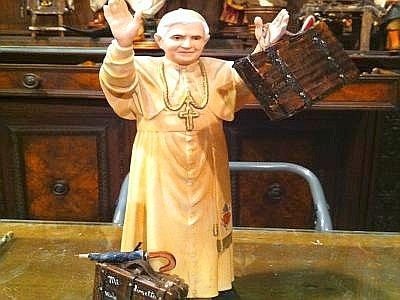 L’annuncio delle dimissioni del Papa non ha colto di sorpresa la creativita’ della famiglia Ferrigno, considerata tra i caposcuola nell’arte della terracotta napoletana. “E’ gia’ pronta – dice Marco Ferrigno a Labitalia – la statua che riproduce Papa Ratzinger con due valigie: una in mano e una poggiata in terra”. “Su quella poggiata in terra – continua – abbiamo scritto ‘mi dimetto’. Non ci abbiamo pensato molto a come realizzarla: del resto, e’ la notizia a creare le nostre opere e, anche in questo caso piu’ unico che raro, non poteva essere altrimenti”. “Ho avuto la fortuna di incontrare Papa XVI – ricorda Marco Ferrigno – in un’udeinza privata nel settembre 2008. Un bel ricordo: sicuramente, era un Papa che sapeva come usare le parole, a differenza forse del precedente (Giovanni Paolo II ndr) che, per comunicare, non aveva bisogno di parlare”.