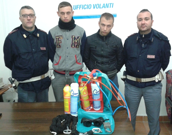 Immediatamente intervenuti, i poliziotti li hanno raggiunti e bloccati. A seguito di un controllo, gli agenti hanno rinvenuto, in uno zaino indossato da uno dei due ragazzi, un kit di fiamma ossidrica composto da due bombole ed altre due bombole di riserva; una chiave multidadi; una pinza; un taglierino; un lucchetto ed una catena antifurto tranciati posti a protezione della moto.