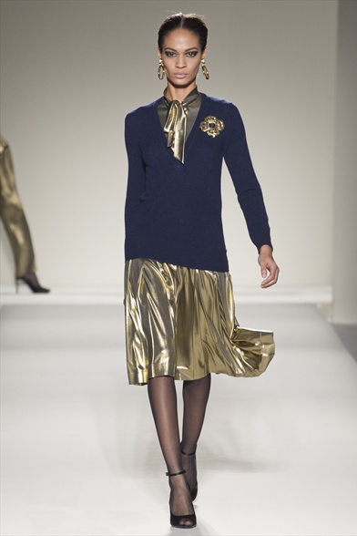 Dunque, sì all’abbinata mini paillettata o impreziosita da decori e jais. Oppure, gonna lunga ( o midi) plissettata di una tonalità cangiante come l’oro o l’argento e una piccola cintura in vita dello stesso colore richiamato anche dai bijoux e dalla pochette. Tinta unita e in contrasto per il pull (da Moschino: pull a coste blu abbinato ad una gonna XL dorata).