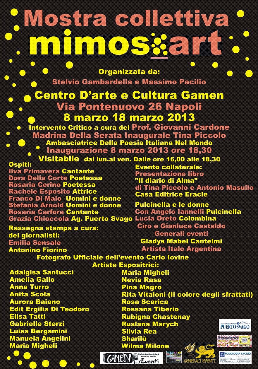 La kermesse, che sarà ripresa dalle telecamere dei giornalisti Emilia Sensale e Antonino Fiorino e catturata dalla macchina fotografica di Carlo Iovine, prevede tantissimi ospiti oltre alle decine di artisti espositrici: le cantanti Ilva Primavera e Rosaria Canfora, la poetessa Dora Della Corte, l’attrice Rachele Esposito, gli ex concorrenti di ‘Uomini e Donne’ Franco Di Maio e Stefania Arnold, Grazia Chiocciola dell’Agenzia Puerto Svago, l’artista italoargentina Gladys Mabel Cantelmi, Ciro e Gianluca Castaldo della Generali Eventi, gli artisti Angeli Iannelli e Lucia Oreto che proporranno ‘Pulcinella e le donne’, senza dimenticare la partecipazione di tanti altri ospiti che daranno il proprio contributo alla buona riuscita dell’evento. Tutte le opere esposte saranno esposte dalle ore 16 alle 18 presso il Centro GAMEN fino al giorno 18 marzo, ma saranno anche visibili all’interno di un accurato catalogo ideato dal grafico Daniele Pacilio con la supervisione del critico Giovanni Cardone, di Tina Piccolo e il commento finale di Stelvio Gambardella: nel medesimo catalogo, sarà presente un’apposita sezione destinata ad una raccolta di poesie dedicate all’universo femminile, componenti scritti e proposti per l’occasione da tantissimi personaggi del mondo della cultura partenopea.