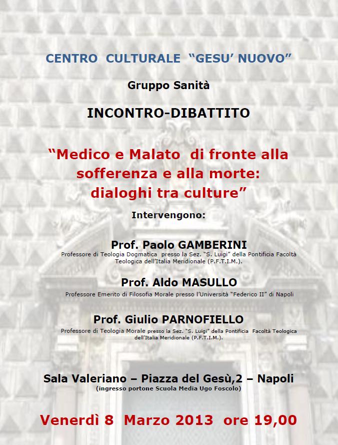 Venerdì 8 marzo 2013 alle ore 19, presso la Sala Valeriano in Piazza del Gesù 2 a Napoli, si terrà l’incontro-dibattito su “Medico e malato di fronte alla sofferenza ed alla morte: dialogo fra culture”.