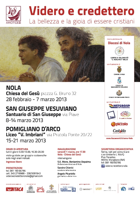 Dopo il grande successo di pubblico riscontrato durante l’esposizione avvenuta presso la Chiesa del Gesù di Nola, la Mostra Itinerante “Videro e credettero. La bellezza e la gioia di essere cristiani.”, sarà nuovamente visitabile a San Giuseppe Vesuviano, nei locali del Santuario di San Giuseppe. La nuova esposizione durerà dall’8 al 14 marzo e, come nei giorni precedenti, sono previste visite guidate al percorso di testi e immagini che compone la mostra, suddivisa in cinque sezioni, ognuna della quali ha lo scopo di mettere in luce il realismo e la ragionevolezza della fede come l’unica che può rispondere al cuore dell’uomo, fatto per l’infinito. Anche a San Giuseppe Vesuviano è prevista l’ampia presenza degli alunni delle scuole locali e dei comuni limitrofi, cui è rivolto in particolare l’invito a partecipare all’iniziativa promossa dalla Diocesi di Nola e dal Centro di Solidarietà “G. Merliano” Onlus, in occasione dell’Anno della Fede. Proprio dalle scuole si è avuta, infatti, una grande risposta in termini di affluenza durante l’esposizione nolana della Mostra, che ha saputo comunicare ai giovani visitatori l’attualità del tema trattato. Dopo il 14 marzo la Mostra lascerà San Giuseppe Vesuviano per essere esposta, dal 15 al 21 marzo presso il Liceo “V.Imbriani” di Pomigliano d’Arco.
