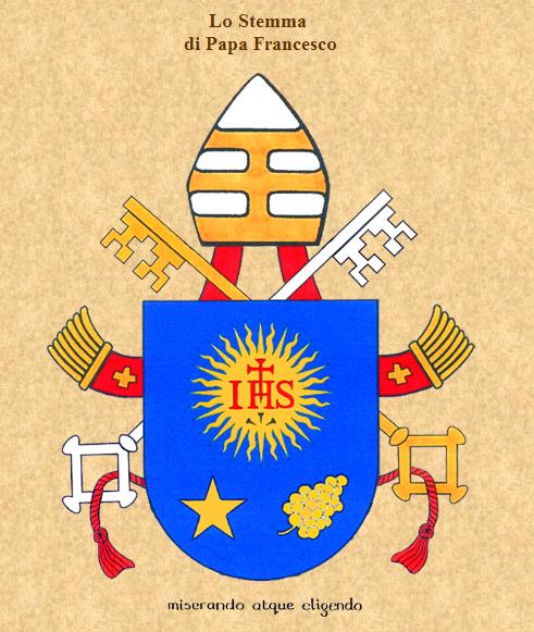 Nei tratti, essenziali, il Papa Francesco ha deciso di conservare il suo stemma anteriore, scelto fin dalla sua consacrazione episcopale e caratterizzato da una lineare semplicità. Lo scudo blu è sormontato dai simboli della dignità pontificia, uguali a quelli voluti dal predecessore Benedetto XVI (mitra collocata tra chiavi decussate d’oro e d’argento, rilegate da un cordone rosso). In alto, campeggia l’emblema dell’ordine di provenienza del Papa, la Compagnia di Gesù: un sole raggiante e fiammeggiante caricato dalle lettere, in rosso, IHS, monogramma di Cristo. La lettera H è sormontata da una croce; in punta, i tre chiodi in nero. In basso, si trovano la stella e il fiore di nardo. La stella, secondo l’antica tradizione araldica, simboleggia la Vergine Maria, madre di Cristo e della Chiesa; mentre il fiore di nardo indica San Giuseppe, patrono della Chiesa universale. Nella tradizione iconografica ispanica, infatti, San Giuseppe è raffigurato con un ramo di nardo in mano. Ponendo nel suo scudo tali immagini, il Papa ha inteso esprimere la propria particolare devozione verso la Vergine Santissima e San Giuseppe.