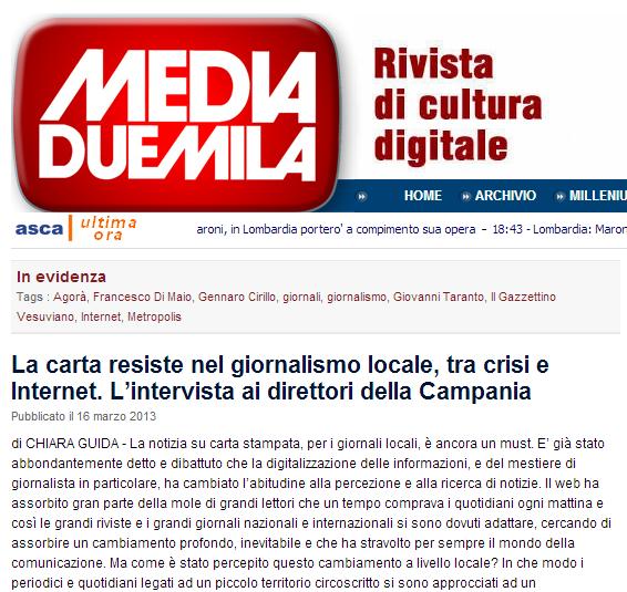 Anche il direttore de Il Gazzettino Vesuviano, Gennaro Cirillo, è tra i protagonisti dell’inchiesta della rivista di cultura digitale MediaDuemila, che ha condotto una indagine tra le realtà locali per capire come si stanno evolvendo nell’epoca del digitale. Riferimento, naturalmente, anche all’esperienza del web rappresentata dal nostro quotidiano online www.ilgazzettinovesuviano.com che continua a crescere.