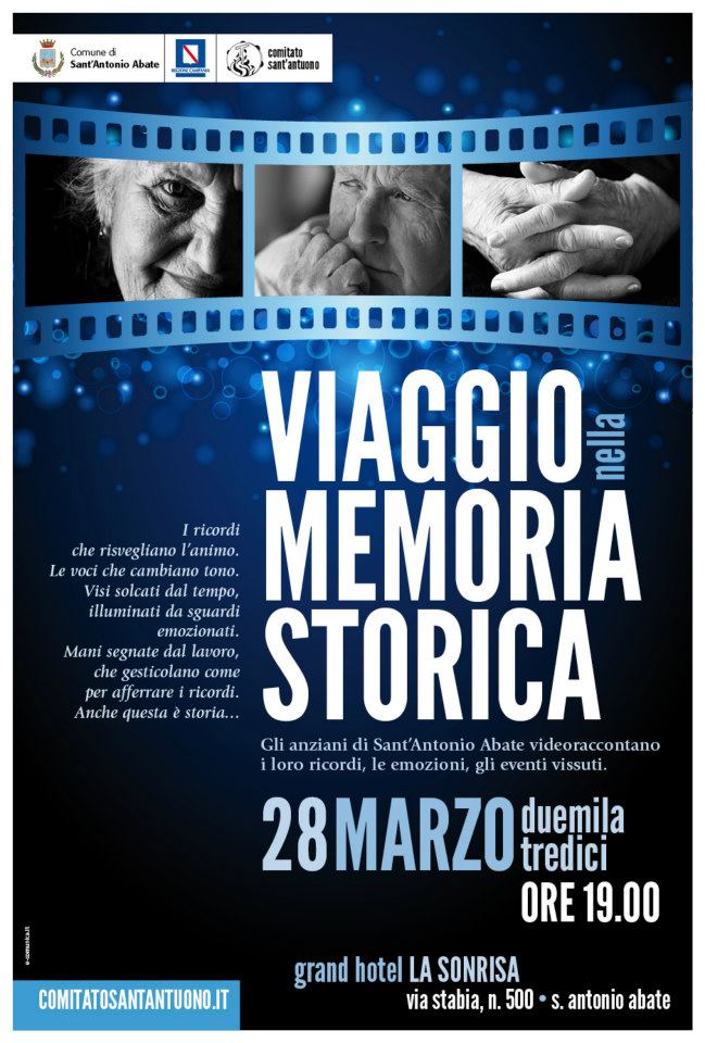 Gli anziani di Sant’Antonio Abate video raccontano la propria vita grazie al progetto “Viaggio nella memoria storica”, curato dal Comitato Sant’Antuono. Il progetto sarà presentato al pubblico in occasione dell’ottantaquattresimo anniversario della fondazione del Comune di Sant’Antonio Abate, giovedì 28 marzo alle ore 19 presso il Grand hotel “La Sonrisa”.
